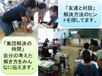 「先に家を出た弟を,自転車に乗った兄が追いかけたら,何分後に兄は弟に追いつくか」という問題の解き方を考えました。前の時間に使った表を再度活用したり,立式した後,言葉で友達に説明をしたりして確認しながら,問題解決しようとがんばっていました。他のクラスの先生も,たくさん参観に来られました。