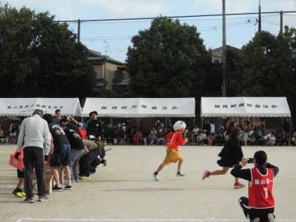 午後の部では各種団体が気持ちと呼吸を合わせて歩く「ムカデ競争」や,仮装が面白かった「PTA競技 みんなで変身!走ってGO!」,ラグビーボールをチームで送る競争「リレーボール」が行われました。