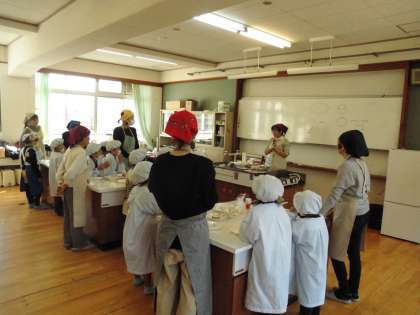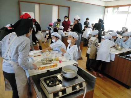 19日(火)に,自分たちが育てたさつまいもを使って,“さつまいもパーティー”をしました。西京食育指導員の方にもお手伝いをしていただき,いももち・さつまいもの焼き菓子・スティックポテトを調理しました。保護者の方もやり方を教えてくださったので,上手にできました。