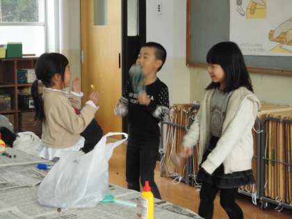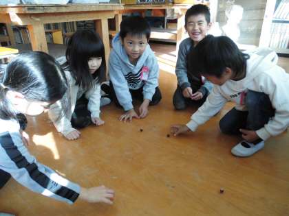 秋見つけに出かけた時に拾ったどんぐりや葉っぱを使って,マラカスやどんぐりごまを作って遊びました。「どんぐりごまは,太いどんぐりの方が長い間回るよ!」「葉っぱに顔を書いたらかわいくなるよ。」などと子どもたちは新しい発見を楽しく学びました。
