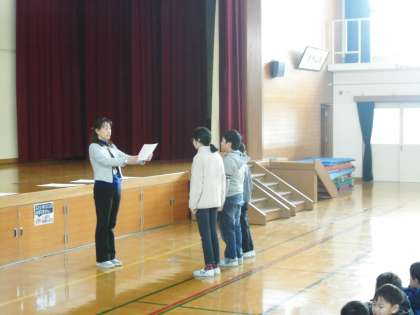 「京都府マスターズ綱引き交流大会」「読書感想文」「書き初め展」「松尾中学校区少年タイム駅伝」「部活動交流会卓球の部・タグラグビーの部」「全国教育美術展」などの賞状や参加賞の紹介がありました。受賞のみなさんおめでとう!