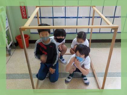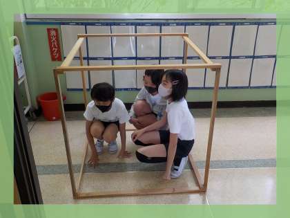 算数の体積の学習で,喜多先生の手作りの1㎥の中に入って1㎥の大きさを実感しました!思っていたよりも1㎥は大きかったようで「みんな入れるわ!」と驚いた様子でした。