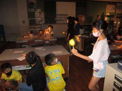 理科室を真っ暗にして,太陽に見立てた光源から月にどのように光が当たって,どのような見え方になるのか学習しました。