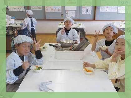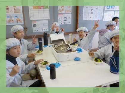 家庭科の学習で調理実習をしました。人参とブロッコリーとキャベツのゆで野菜サラダを作りました。班ごとに切る係やゆでる係などに分かれて友だちと協力して作りました。人参は少し硬かったようですが自分たちで作れたサラダは,おいしく感じたようで「おいしい」といいながら嬉しそうに食べていました。料理の大変さも実感できた様子でした。