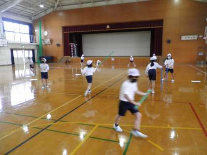 体育科では『ようぐあそび』をしています。長い棒を立てて棒が倒れる前につかみに行ったり,手の上に載せてバランスをとったり,またフラフープをしてみたりなど用具を用いてバランス感覚を楽しんでいます。