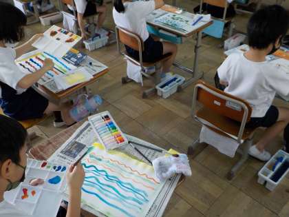 絵具チューブから出したそのままの色ではなくて,色と色を混ぜたり,水で濃さを変えたりしながら,自分の「いい感じ!」を作りました。