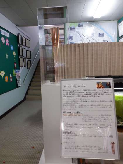 嵐山東小学校の本館,職員室前において,東京2020オリンピック聖火リレートーチの展示を行っています。