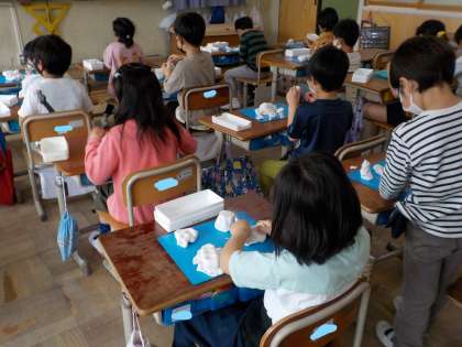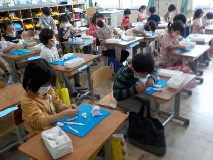 図画工作科で「にぎにぎねん土」を学習しました。にぎった形からいろいろと工夫して,楽しい形を作りました。どんなものができたのかな?おうちの人に話してみてね。