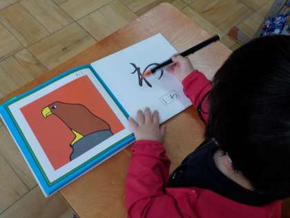 文字をなぞったり,知っている言葉を声に出して読んだりしています。