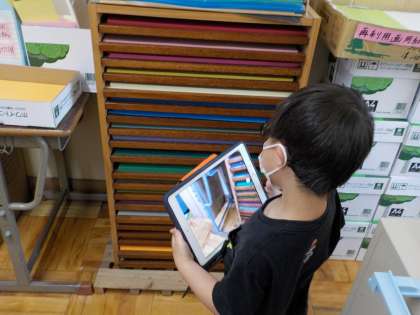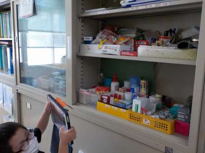 活動に慣れてきて,自分でiPadを使って見つけたものを写真にとることができるようになりました。たくさんの事務用品や用紙が置かれている室内を一周したあと,最後に事務の先生の姿もパシャリ。