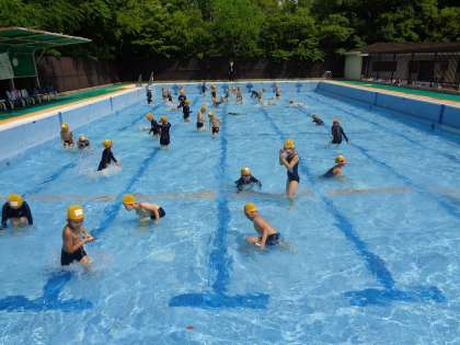今日は少し水位が上がり,昨日とは違った活動ができました。今日は水かけや碁石拾いをしました。チームに分かれてどちらの方が多く碁石が拾えるか競争もしました。暑くなってきたので,体調に気を付けながら安全に楽しみましょう!