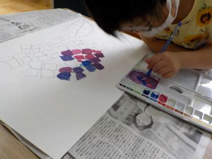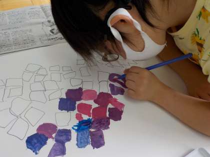 赤,青,白,藍色を,少しずつ筆先につけながら,色をどんどん変化させて楽しみながら取り組んでいました。