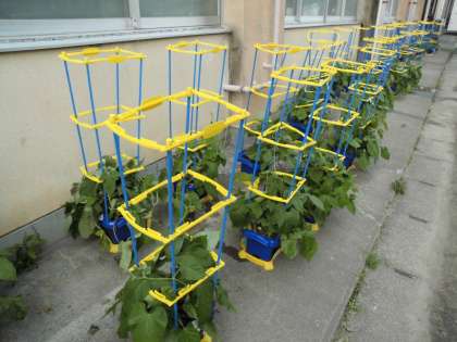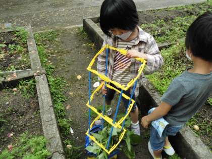 「あさがおが伸びすぎてたおれてしまう・・・」「友だちのつるが植木鉢に入ってくる・・・」「友だちのあさがおとからまった・・・」アサガオの成長と共に,困ったことがでてきました。みんなでどうしようかと考えた末に,「幼稚園で棒みたいなん立ててたで!」「じゃあ,棒を立ててみよう!」ということで,支柱を立てることになりました。立てた次の日にはもうつるが巻付き,ごきげんで上に上に伸びていくあさがおさんです。