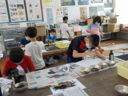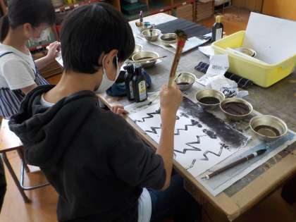図画工作科の学習では,前回の単元で作成したおもしろ筆を使って,「墨と水から広がる世界」の学習に取り組みました。筆の特性を生かしながら,墨と水を用いて作品を完成させることができ,子どもたちもとても満足の出来栄えだったようです。様々な工夫を凝らして表現する姿が見られました。