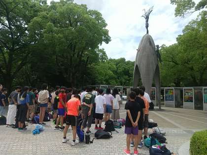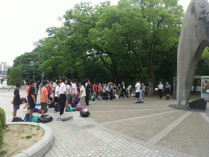 原爆の子の像の前で平和集会を開きました。平和であれば,原爆が投下されなければ,いろんな未来が待っていた貞子さん。貞子さんのような人が世界中からなくなるよう,私たちがすべきことをしていく決意を表明した6年生でした。