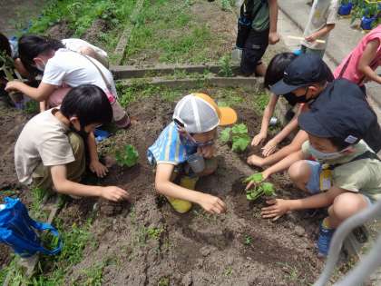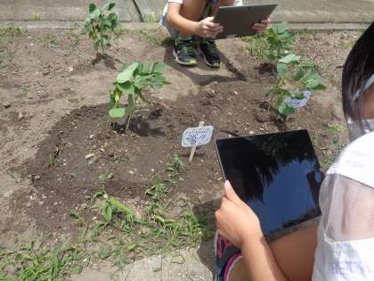 昨日二年生の畑に,みんなで決めたきゅうり・ナス・枝豆をうえました。今日はタブレットを使って観察をしました。どんな風に育っていくのかな?楽しみだね!