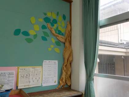 今年は一年生が入学したので,教室の後ろには桜の木に満開の花が折り紙でつけてあったのですが,花が散ったころにはがしたままになっていたので,今日は葉をつくることにしました。