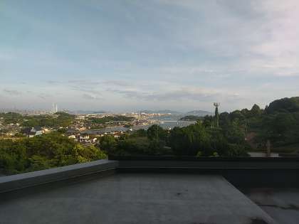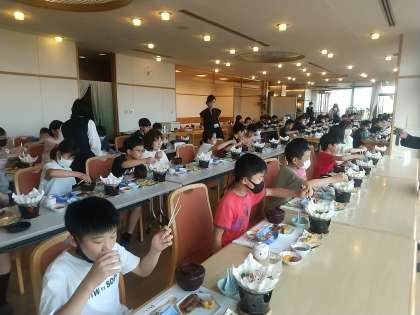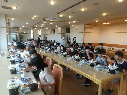 良寛荘からは海が見えます。今日は天気が良いので青い海と青い空と山々も遠くまで見えて晴れ晴れとした気持ちになります。そんな景色を眺めながら豪華な食事をとります。最高ですね。しっかり栄養をとって,明日に備えてくださいね。