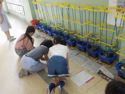 台風が来ているので、大切に育てているトマトが被害にあわないように教室前に動かしました。実がなってきているので、みんなで観察もしました。何センチくらい伸びたていたかな。