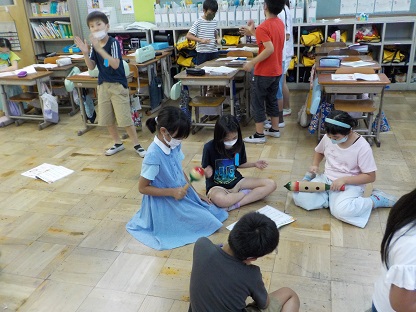 音楽の学習で,「いろいろな木の実」の曲に合わせて演奏をしました。子どもたちは,4拍子のリズムを意識して,ギロ・マラカス・クラベスの打楽器の演奏をしました。
