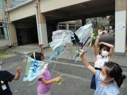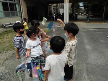 先週作った「ひらひら ゆれて」の作品を外に持って行き,風に当てました。自分の作品がひらひら風に揺られているのを見て,子どもたちは大喜び!自分の作品のお気に入りポイントやお友達の作品の素敵をたくさん発見しました。