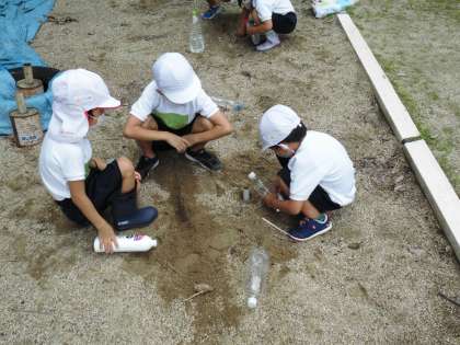 今日の天気は・・・夏らしい!というほどではありませんでしたが,せっかくみんなで「なつはこんな遊びがしたい!」と水遊びのリクエストがあったので,みんなで水と土を使って水遊びを楽しみました。水がかかって「気持ちいい!」「もっとかけて〜」「泥って気持ちいいなあ」普段の学校ではできない遊びを思いっきり楽しむことができました。