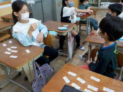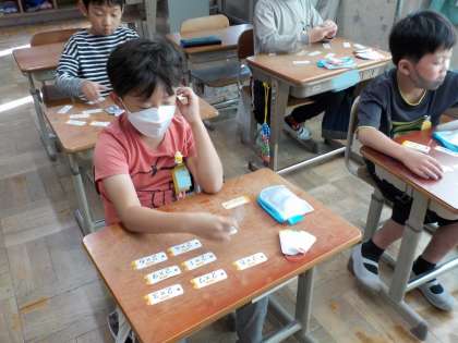 算数でかけ算を学んでいます。5のだんの九九、2のだんの九九を学習しました。九九カードを使って、友達と問題を出し合いながら繰り返し覚えていきました。