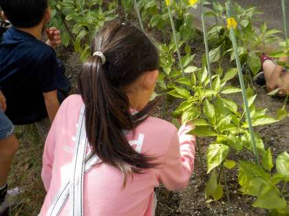 毎日水やりをしてお世話をしています。「先生、ピーマンができてきました!」と報告してくれた人がいたので、生活科の時間にピーマンの様子をみんなで見に行きました。