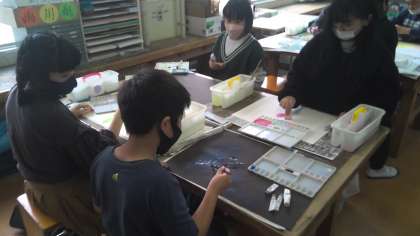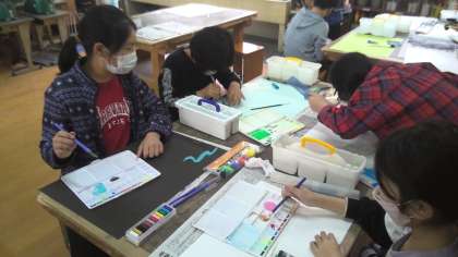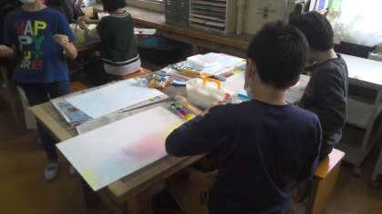今日は、5年生で初めての図画工作の学習をしました。子どもたちは、今まで学習した技法を組み合わせて、自分たちの気持ちを、いろいろな形や色で表していました。