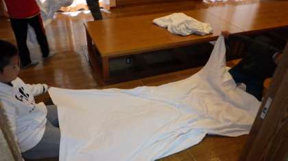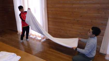 シーツをきれいにたたむには、仲間の協力が不可欠です。