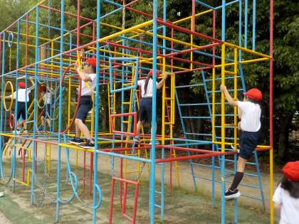 遊具の使い方を確認した後、総合遊具の3階まで上がって滑り台を滑りま