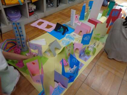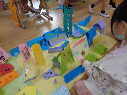 図画工作科で「おってたてたら」の学習をしました。どうやって折ったら紙が立つのかな…といろいろな立たせ方を考えました。また、切ったり、絵を描いたりして、たくさんのすてきな作品を作ることができました。最後にはみんなの作品を合わせて、街を作りました。みんなそれぞれに作品の良さが溢れていて、とても素敵な街になりました。