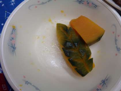 先日の給食でかぼちゃの煮つけが出ました。なんと!かぼちゃの形が葉っぱの形!とてもラッキーな日でした!