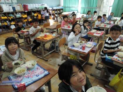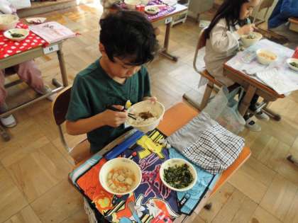 給食の時間に調理してもらった芋づるをいただきました。甘じょっぱく煮込んであって、シャキシャキした食感でがとてもおいしかったです。料理してもらった芋づるはすぐに売り切れました。