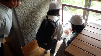子どもたちは、数センチのプレートを探して歩きまわっています。