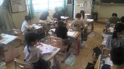 図画工作科の学習では、初めて絵の具を使いました。好きな2色を選び、その2色を混ぜて3色目を作り風船の絵に色を塗りました。水加減が難しそうでしたが、「楽しい」と言って取り組んでいました。