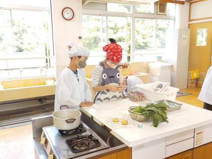 今日は1組が調理実習でした。「ほうれん草のおひたし」と「ゆでいも」に挑戦しました。じゃがいもは包丁で皮をむきました。班で声をかけ合って調理の手順を確認したり、ゆでたときの野菜の様子を観察したりすることができました。出来上がったものを食べると「おいしい!」という声がたくさん聞こえてきました。