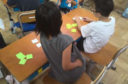 算数科の「たし算とひき算のひっさん」の学習では、2人組で1から9までの数字カードを使って、たし算やひき算をして答えの大きいほうが勝ちというゲームをしました。家でもやりたいと盛り上がっていました。