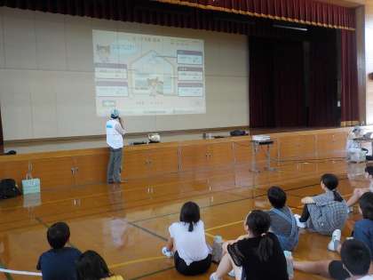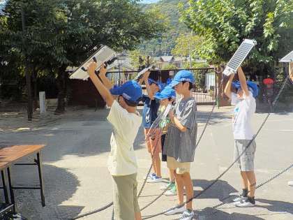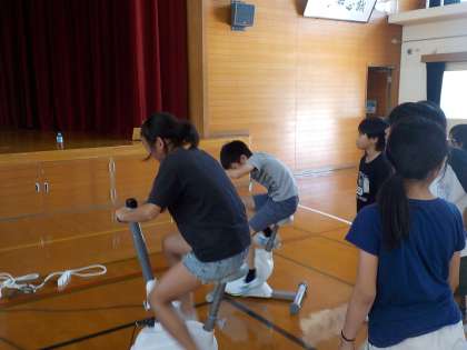 日新電機の方をお招きして、出前授業「電気について学ぼう」を行いました。各グループに分かれて「足こぎ発電」「ソーラーパネル」など様々な発電方法を体験しました。グループで協力して、自転車を一生懸命漕いだり、ソーラーパネルを持ったりして電気を発電しましたが、クーラーを動かすとなるとたった3分半しか動かない電力量だったようです。