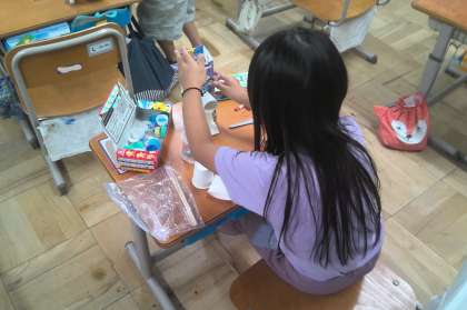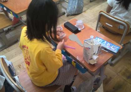 生活科の「あそんでためしてくふうして」の学習では、廃材を使って動くおもちゃを作っています。どうやったらもっと高くとぶかな、動くかなと工夫しながら作っています。