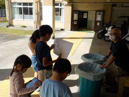 総合的な学習の時間として環境学習に取り組んでいます。ごみ問題に焦点を当て、身のまわりにはどんなごみがあるのかを学校と家庭で調べる学習をしています。学校では、自分たちで調べた後、教頭先生・管理用務員さん・給食調理員さんに学校のごみについてインタビューをしました。インタビューの後「食べ残しのごみが2番目に多いなんてしらなかった。」や「もえるごみが多いな。」「まだ使えそうなごみがあった。」などと調べたり聞いたりして分かったことを話してくれました。
