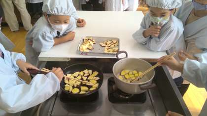 生活科で育てたさつまいもを調理しました。切ってバターで焼いて砂糖をまぶしました。「とても甘くておいしい」とおかわりをたくさんしていました。