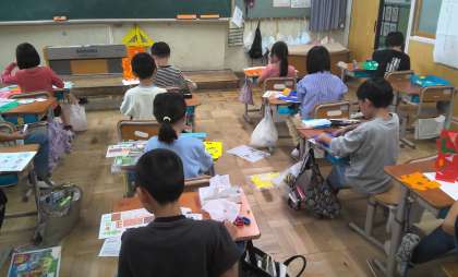 「まどからこんにちは」の学習では、窓から見えるものを描いて立たせました。そのあと、家の前にも飾りをつけました。