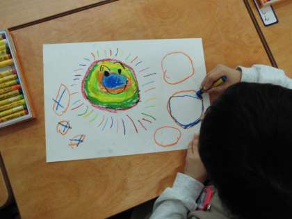 クレパスを使って、自分だけのニコニコ太陽を画用紙に描きました。