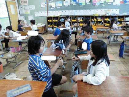 今日は道徳がありました。1組は「ブルラッシュ」のお話をもとに『世界の国の人々と関わること』について、2組は「雨のバス停留所で」というお話をもとに『みんなが使う場所を気持ちよく使うために』ということについて考えました。