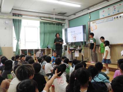 今月のきずなの日は、あおぞら学級さんと交流をしました。クイズなどを交えながら、普段どんなことを学習しているのかを教えてもらった1年生は、「それぞれのチャレンジをして頑張っているんだね。」と驚いていました。