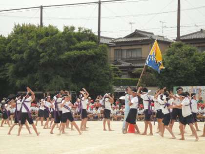 「かまえ‼」のかけ声を合図に気合いをこめてソーラン節を踊りました。「どっこいしょ,どこいしょ」「ソーラン ソーラン」のかけ声とともに,ねじりはちまききりりとしめてビシッと決めることができるようにがんばりました。