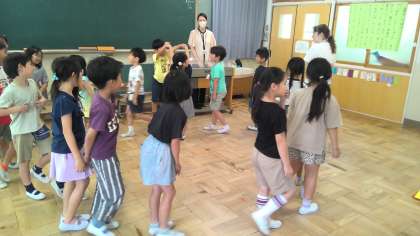 今日の音楽の学習は、ALTのメーブ先生も一緒に活動しました。「ロンドばし」で遊んだり、「BINGO」の歌を一緒に歌ったりしました。