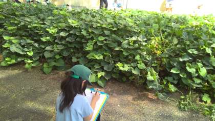サツマイモの観察に行きました。子ども達は、夏休み前のサツマイモ畑の様子と今の様子を写真で比べて、葉っぱが大きくなっていることや、葉っぱの数が増えすぎて土が見えなくなったことに、改めて驚いていました。