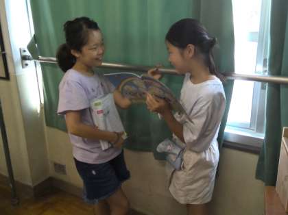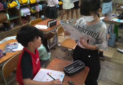 外国語活動では「What 〜 do you like?」の表現を使って、友だちと好きな果物や色などをたずね合いました。